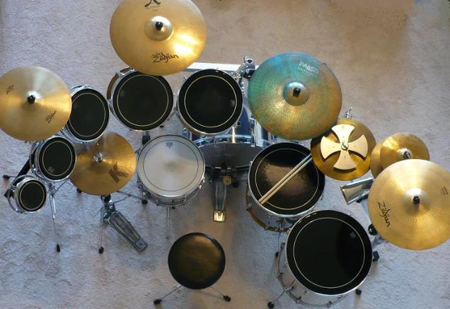 Cowbell, 10" Agazarian Splash, 12" Zilco Crash, 18" Floor Tom, 18" Zildjian Crash