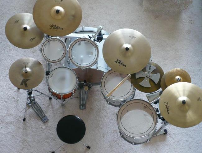 Zildjian A Custom Crash, 12" Pearl Soprano Snare, 12" Tom, 22" Bass, 20" Zildjian Medium Ride, 14" Tom,